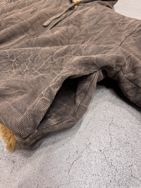 Oversized and slightly cropped fitting jacket, designed with a padded neck + shoulders part, thermal-fabric hood, and discreet hidden pockets.