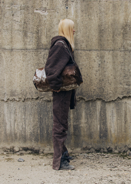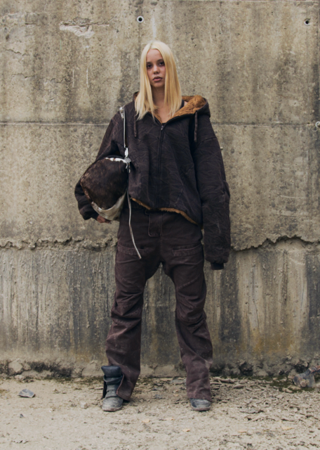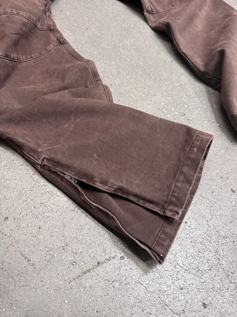 The washed brown straight-fit pants, designed with a standout knee panel and dart construction, create a distinctive silhouette, while two zippers and an adjustable waistband make this piece as versatile as it is striking.
